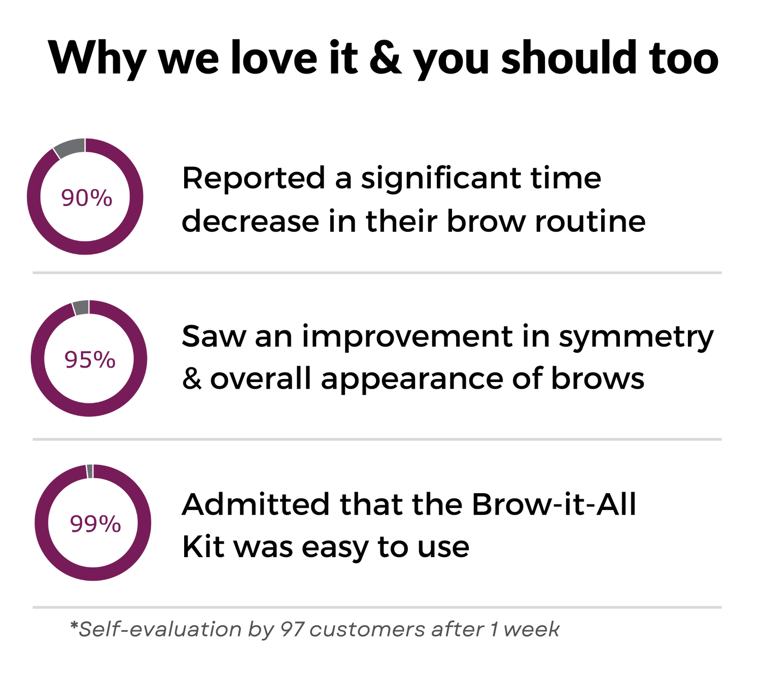 Our Brow-it-all Kit was created for you to spend just SECONDS on your eyebrows. In 3 easy steps, you will have two perfectly symmetrical eyebrows and that takes about 10-15 seconds to implement.